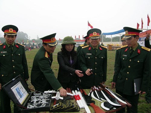 Lãnh đạo huyện Kim Động kiểm tra mô hình, đồ dùng huấn luyện của LLVT huyện.