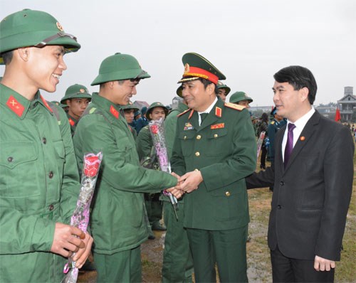 Lãnh đạo Bộ tư lệnh Quân khu 2 tặng hoa và động viên thanh niên lên đường nhập ngũ.