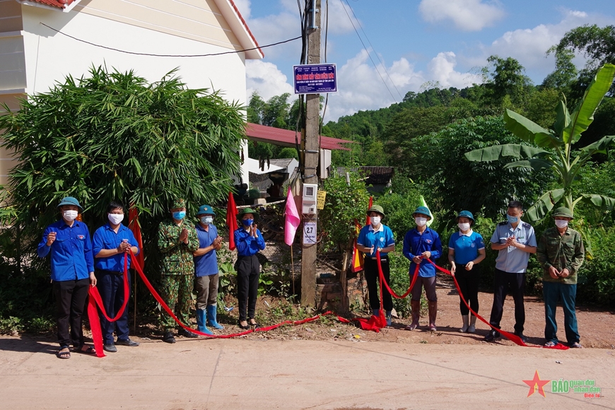 Cán bộ, chiến sĩ Đồn Biên phòng Cửa khẩu Chi Ma cắt băng khánh thành công trình “Thắp Sáng đường thôn”. |
