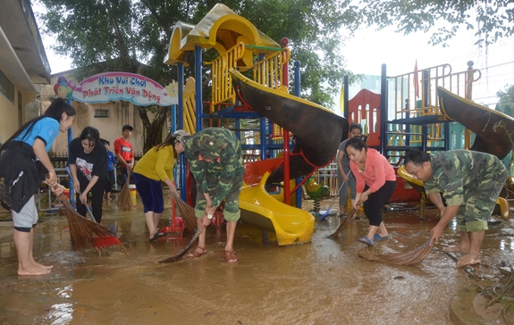 Tại tỉnh Quảng Ngãi, để kịp thời giúp người dân nhanh chóng ổn định cuộc sống, ngay sau khi nước rút, sáng 10-12, Ban CHQS huyện Nghĩa Hành đã huy động hơn 30 cán bộ, chiến sĩ, lực lượng dân quân, tự vệ phối hợp với các lực lượng địa phương dọn dẹp, vệ sinh môi trường tại một số trường học, trụ sở làm việc bị ngập sâu trên địa bàn xã Hành Dũng. Bộ CHQS tỉnh chỉ đạo các đơn vị trong địa bàn xảy ra ngập lụt tổ chức quân số trực 24/24, nhất là tại các điểm có nguy cơ xảy ra lũ quét, sạt lở đất, chuẩn bị các phương tiện sẵn sàng ứng phó kịp thời khi có tình huống xảy ra.
