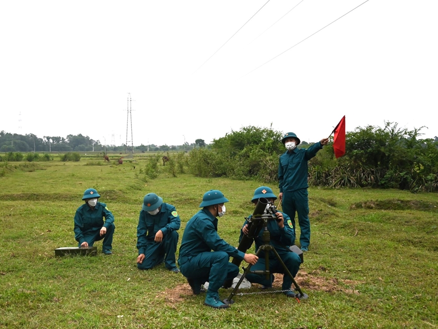 Theo khẩu lệnh của đồng chí Vũ Công Hiếu, Chỉ huy trưởng Ban CHQS phường Trung Hưng (thị xã Sơn Tây, TP Hà Nội), các chiến sĩ dân quân thuộc khẩu đội cối 82mm nhanh chóng thao tác lấy phần tử bắn, nạp đạn... với động tác khá thành thục.