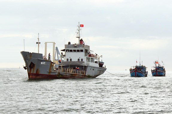 Tàu của Hải đoàn 129 cứu kéo tàu của ngư dân gặp nạn trên biển về đất liền.