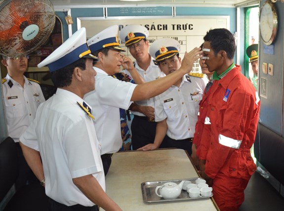 Lãnh đạo, chỉ huy Hải đoàn 129 động viên ngư dân được đơn vị cứu trên biển.