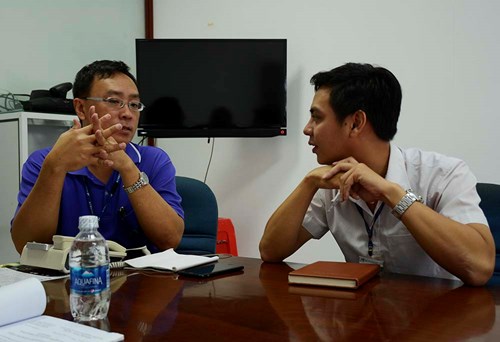 Trung đội trưởng Trung đội tự vệ Đỗ Hoài Linh (bên phải) đề xuất công tác với lãnh đạo Công ty TNHH Minh An (Khu công nghiệp Nhơn Trạch 3).