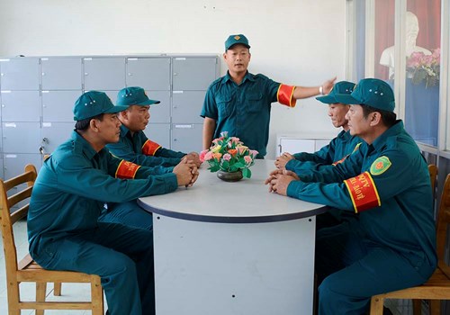 Kíp tuần tra của Trung đội tự vệ Công ty TNHH Pouchen Việt Nam (TP Biên Hòa) phổ biến nhiệm vụ trước giờ xuất phát.