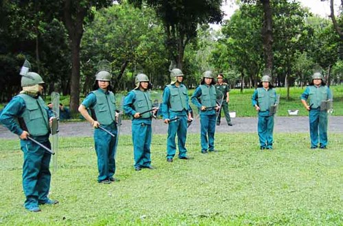Trung đội tự vệ Công ty cổ phần hữu hạn Vedan Việt Nam thực hành luyện tập kỹ năng xử lý tình huống giữ gìn an ninh trật tự.