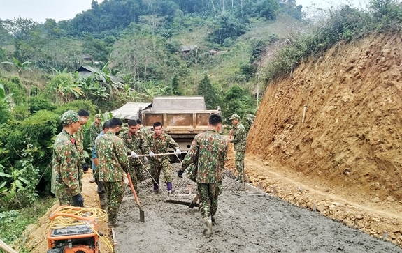| Cán bộ, chiến sĩ Trung đoàn 246 giúp dân làm đường bê tông liên thôn ở xã Xuân Lạc (Chợ Đồn, Bắc Kạn). |