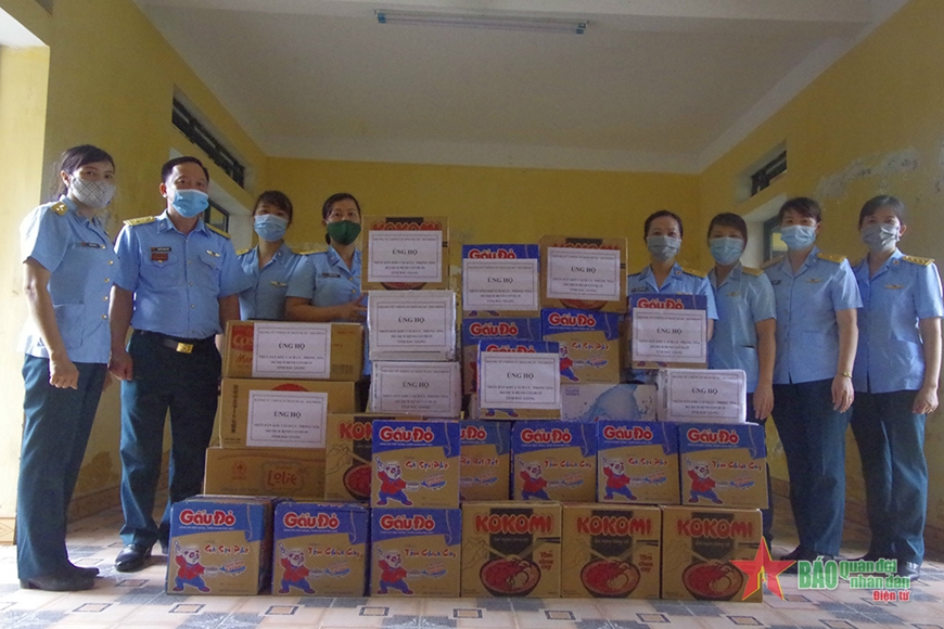 | Đại úy QNCN Đỗ Thị Thu Hà (ngoài cùng, bên trái) cùng cán bộ, hội viên chuẩn bị quà ủng hộ đồng bào khu cách ly ở Bắc Giang (tháng 4-2021). |