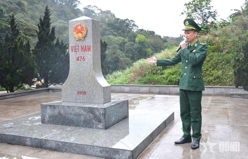 | Thiếu tá Bùi Song Anh, Trạm trưởng Trạm Biên phòng cửa khẩu quốc tế Cầu Treo giới thiệu cột mốc. |