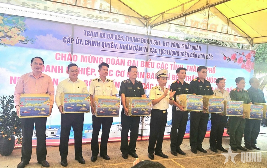 | Các tàu chở đoàn công tác neo tại khu vực gần đảo Hòn Đốc. |