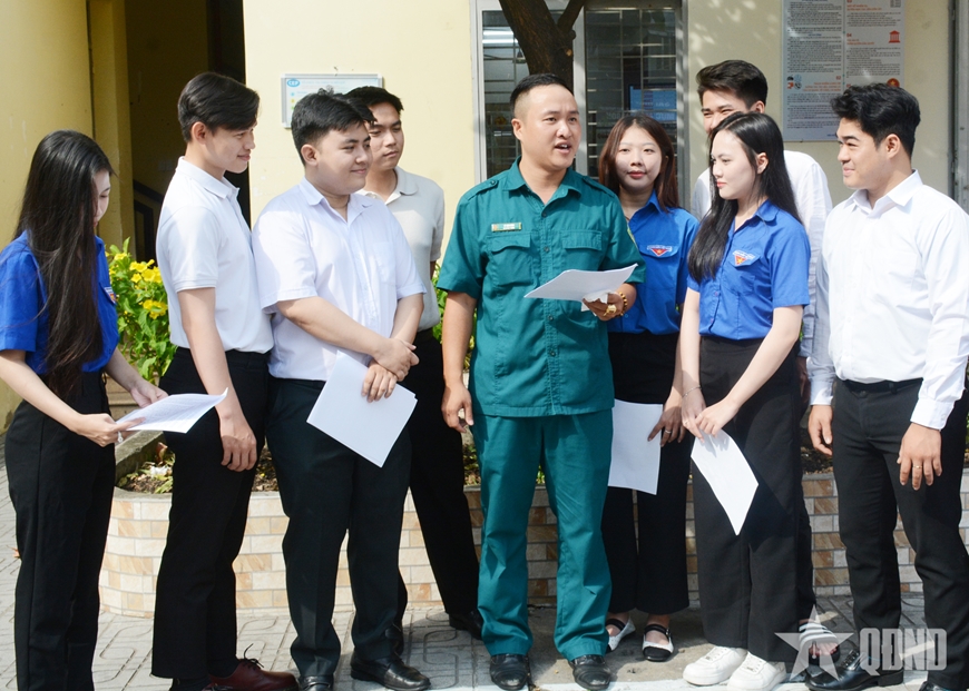 | Cán bộ Ban CHQS phường Tân Sơn Nhì, TP Hồ Chí Minh phối hợp tuyên truyền pháp luật. |