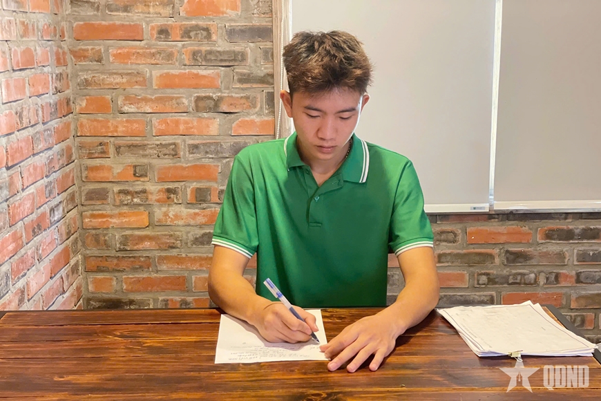 Thanh niên Khúc Thế Hưng, là người đồng bào dân tộc Tày, ở thôn 2, xã Quảng La, tỉnh Quảng Ninh viết đơn tình nguyện nhập ngũ.