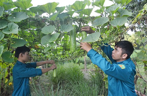 Chiến sĩ dân quân Ban CHQS xã Biên Giới chăm sóc vườn rau.