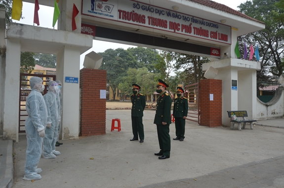 | Cán bộ, học viên Trường Quân sự Quân khu 3 thực hiện nhiệm vụ kiểm soát tại điểm cách ly Trường THPT Chí Linh. |