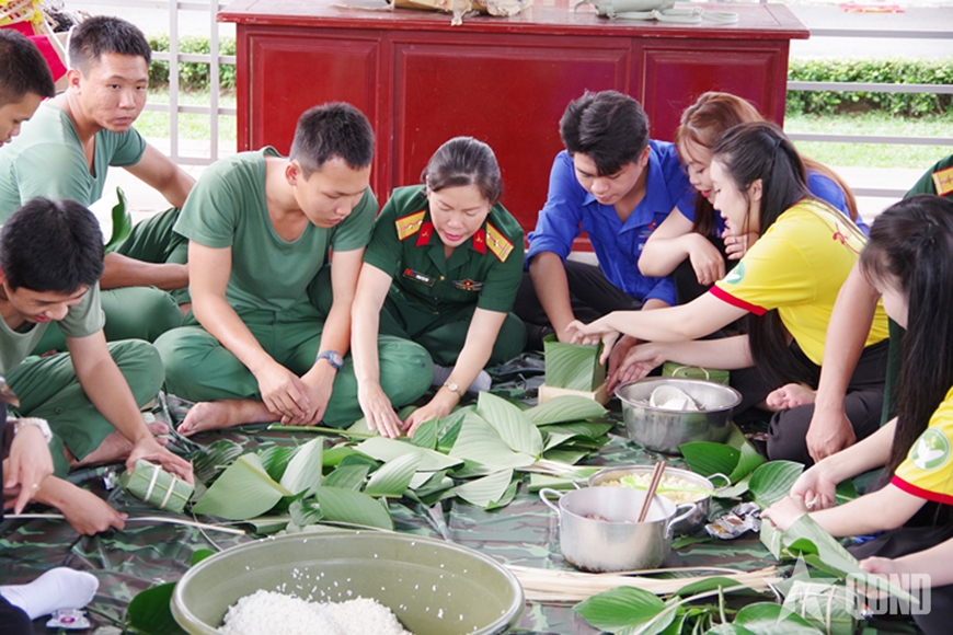 Điểm nhấn nổi bật, thu hút đông đảo cán bộ, chiến sĩ và sinh viên tham gia chính là hoạt động gói bánh chưng - nét đẹp truyền thống mỗi dịp Tết đến, Xuân về. Trong khu vực bếp dã chiến, tiếng cười nói rộn ràng hòa cùng mùi thơm của lá dong, nếp mới. Người rửa lá, người vo gạo, người cắt thịt, buộc lạt... tạo nên bức tranh sinh động, ấm áp tình đồng chí, đồng đội, tình quân dân.