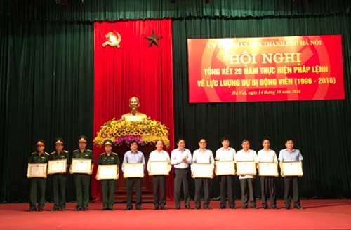 Nhân dịp này, UBND Thành phố Hà Nội tặng bằng khen cho 26 tập thể có thành tích xuất sắc trong 20 năm thực hiện pháp lệnh về lực lượng dự bị động viên (1996-2016).