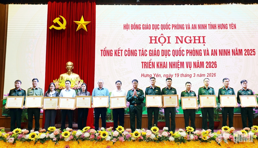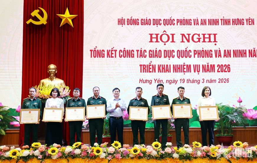 Tại hội nghị, Ban tổ chức trao Bằng khen của Chủ tịch UBND tỉnh Hưng Yên tặng 9 tập thể và 18 cá nhân có thành tích xuất sắc trong thực hiện công tác giáo dục QP-AN năm 2025.