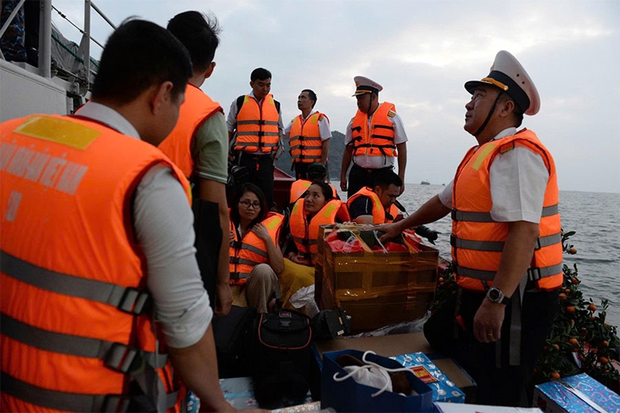 | Đoàn công tác rời tàu lên đảo Hòn Chuối. |