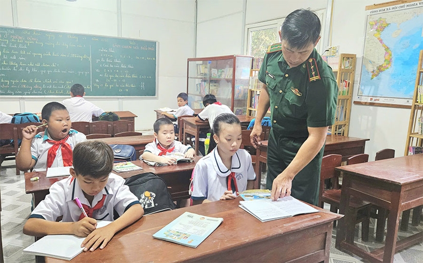 | Trung tá QNCN Trần Bình Phục dạy các em học sinh trên đảo Hòn Chuối. |