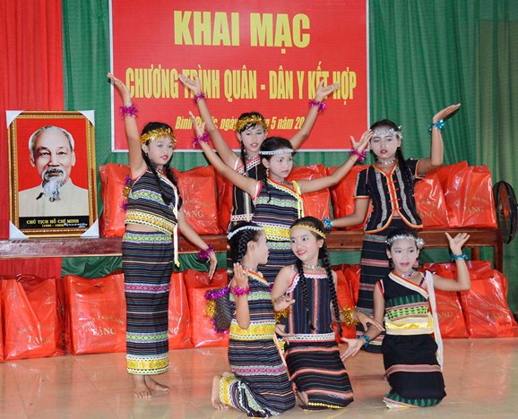 Tiết mục văn nghệ “Tiếng chày trên sóc Bom bo” của các cháu học sinh người dân tộc S’tiêng xã Lộc Thiện. |