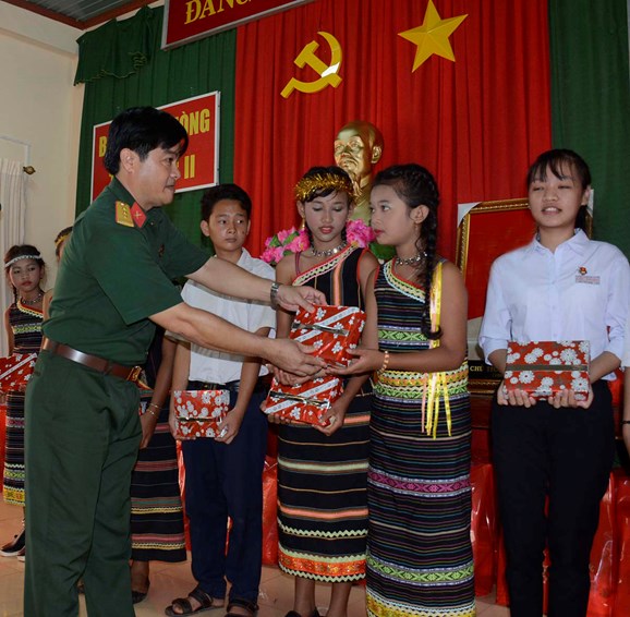 Trao quà tặng các cháu học sinh giỏi xã Lộc Thiện. |