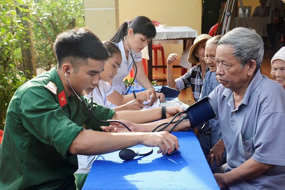 Chiến sĩ quân y và nhân viên y tế địa phương khám bệnh cho các đối tượng chính sách. |