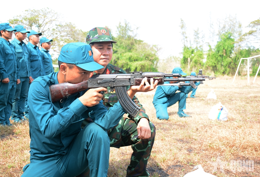 Dân quân TP Hồ Chí Minh luyện tập bắn súng tiểu liên AK. |
