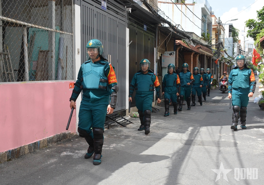 Cán bộ, chiến sĩ dân quân phường An Nhơn, TP Hồ Chí Minh tuần tra địa bàn. |