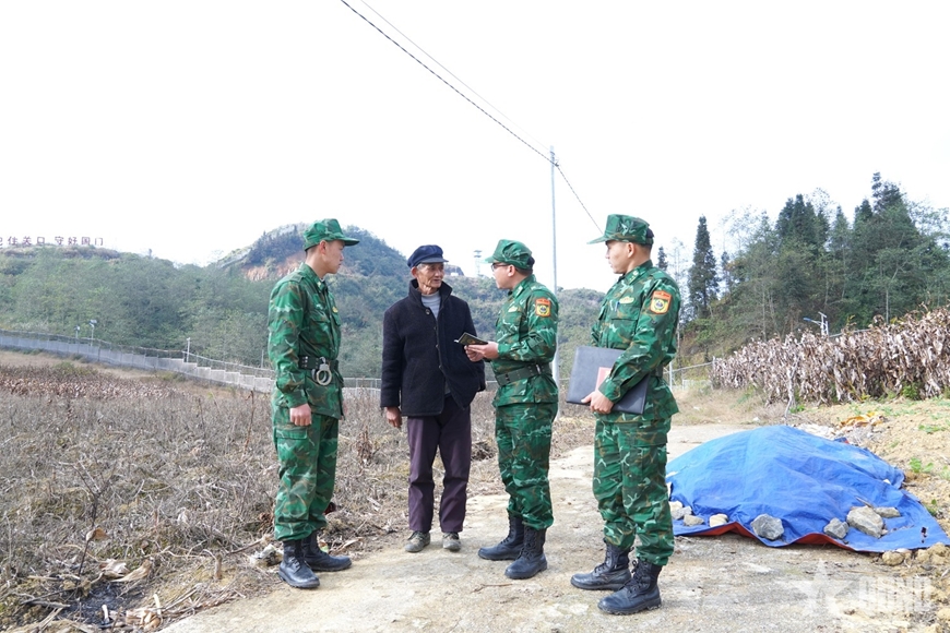 Cán bộ, chiến sĩ Đồn Biên phòng Cửa khẩu Săm Pun, Ban Chỉ huy Bộ đội Biên phòng tỉnh Tuyên Quang, nắm tình hình, tuyên truyền pháp luật cho người dân khu vực biên giới.