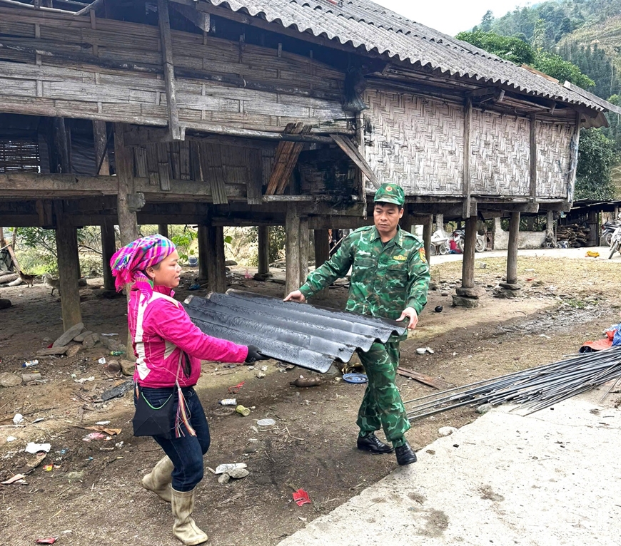 | Cán bộ, chiến sĩ Đồn Biên phòng Cửa khẩu quốc tế Thanh Thủy hỗ trợ người dân sửa chữa nhà ở, góp phần ổn định cuộc sống nơi biên giới. |