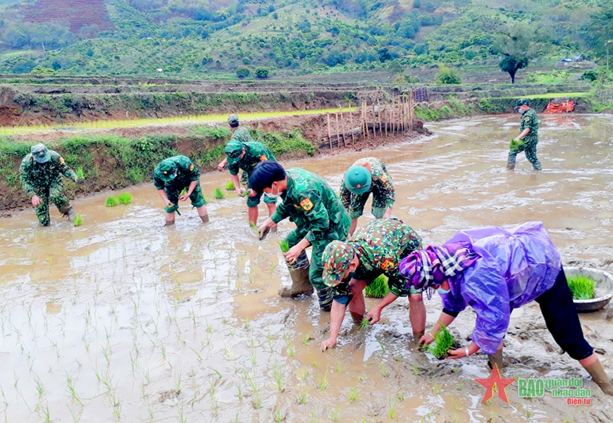 | Cán bộ, chiến sĩ Đồn Biên phòng Cửa khẩu Chiềng Khương cấy lúa giúp hộ gia đình anh Quàng Văn Ban. |