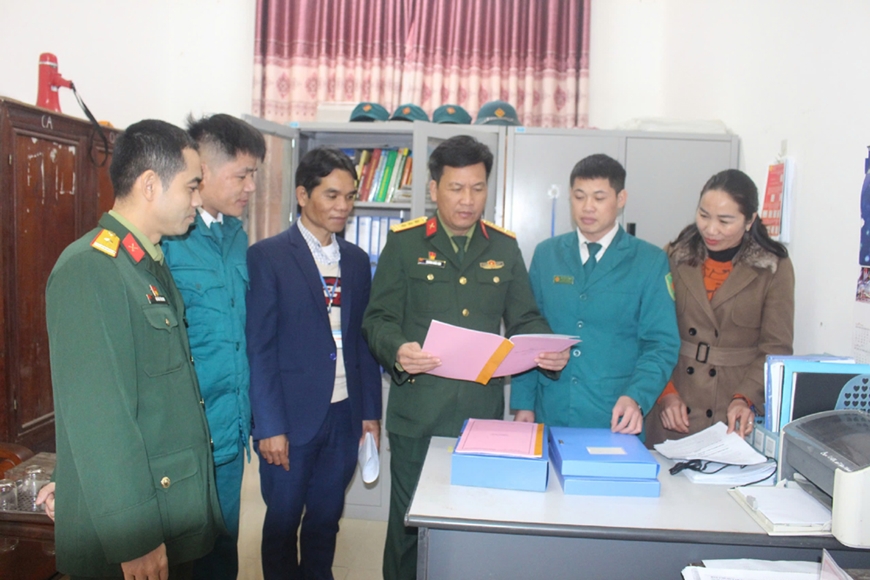 | Cán bộ cơ quan quân sự huyện Quế Phong thường xuyên xuống cơ sở trao đổi công việc để nâng cao chất lượng công tác quân sự địa phương. |