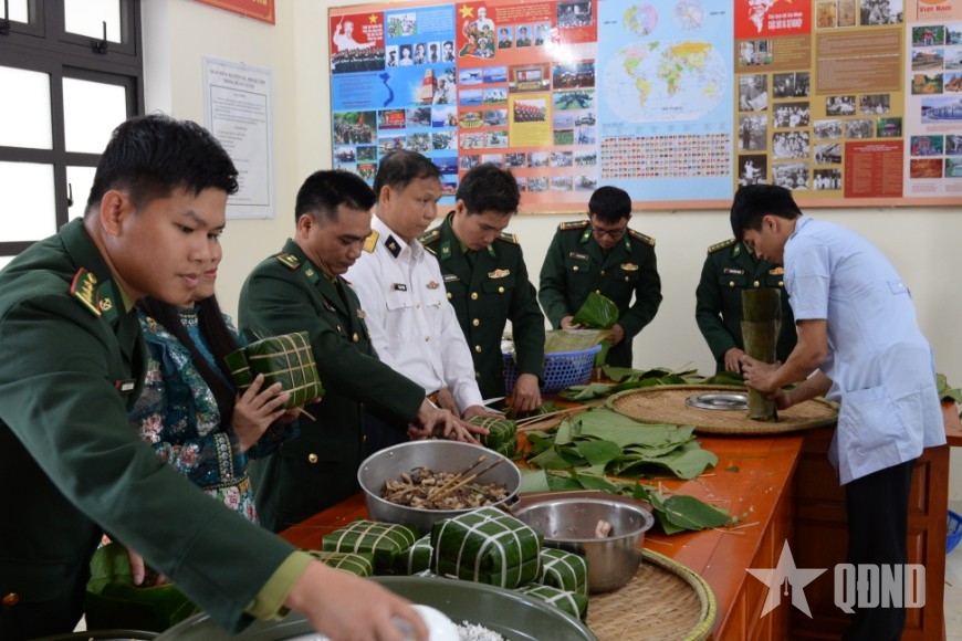 | Quân và dân đặc khu Cồn Cỏ cùng gói bánh chưng. |