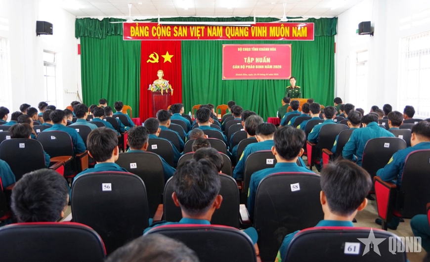 Sáng 27-1, Bộ CHQS tỉnh Khánh Hòa khai mạc lớp tập huấn cán bộ pháo binh năm 2026 cho 120 đồng chí lực lượng thường trực và dân quân trên địa bàn tỉnh. Thượng tá Huỳnh Văn Toàn, Phó chỉ huy trưởng, Tham mưu trưởng Bộ CHQS tỉnh dự và phát biểu.