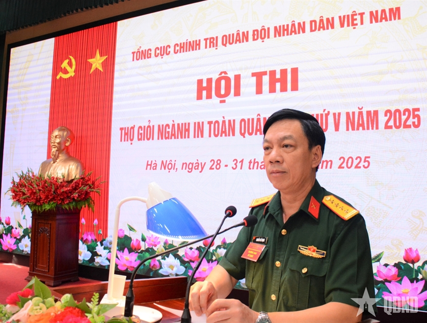 Đại tá Nguyễn Thế Mạnh, Phó cục trưởng Cục Tuyên huấn (Tổng cục Chính trị Quân đội nhân dân Việt Nam) phát biểu chỉ đạo khai mạc Hội thi thợ giỏi ngành in toàn quân lần thứ V năm 2025.