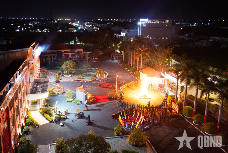 Ngọn lửa trại bừng sáng giữa sân đơn vị như sưởi ấm tình đồng đội, xua tan cảm giác xa nhà trong thời khắc thiêng liêng.