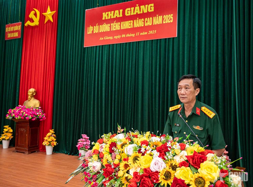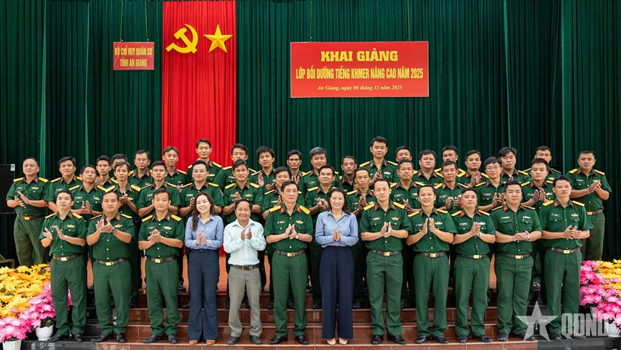 Ngày 6-11, tại Trung đoàn 893, Bộ CHQS tỉnh An Giang phối hợp Trung tâm Ngoại ngữ - Tin học Victory (Trường Đại học Trà Vinh) tổ chức khai giảng lớp bồi dưỡng tiếng Khmer nâng cao năm 2025.