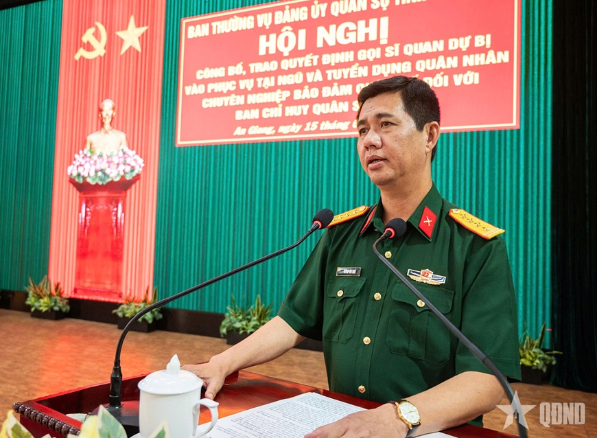 Thiếu tướng Nguyễn Văn Ngành, Ủy viên Ban Thường vụ Tỉnh ủy, Chỉ huy trưởng Bộ CHQS tỉnh An Giang trao quyết định gọi sĩ quan dự bị vào phục vụ tại ngũ và tuyển dụng quân nhân chuyên nghiệp.