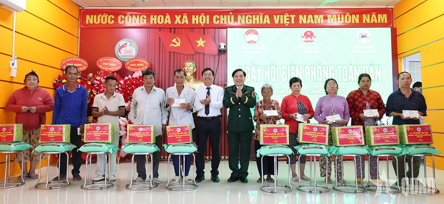 | Đại tá Nguyễn Văn Hiệp, Phó chính ủy Bộ Chỉ huy Quân sự tỉnh, Chính ủy Ban Chỉ huy Bộ đội Biên phòng tỉnh và lãnh đạo địa phương tặng quà các hộ dân có hoàn cảnh khó khăn trên địa bàn. |