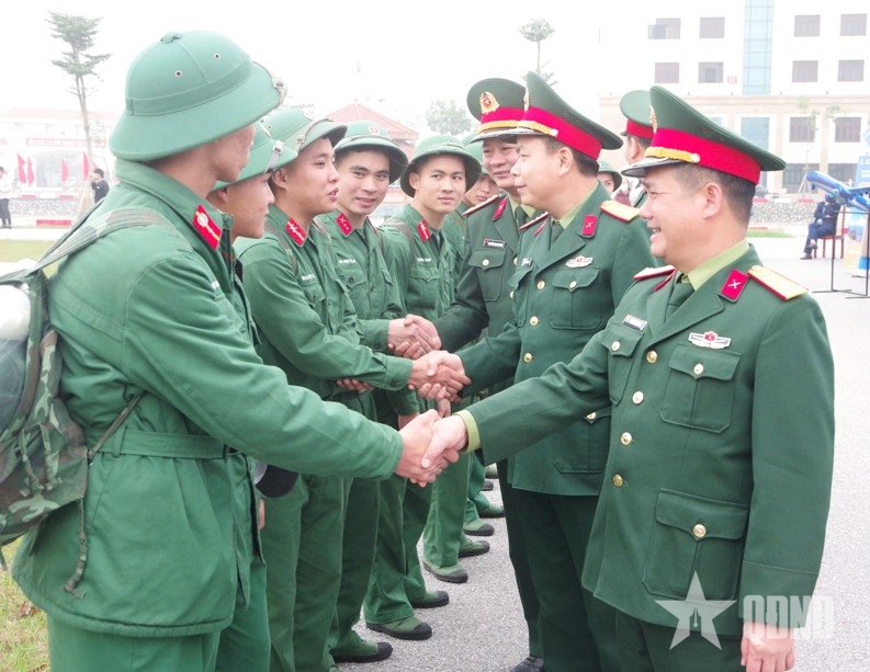 | Đại tá Trần Viết Năng và đại diện Bộ Chỉ huy quân sự tỉnh Bắc Ninh chúc mừng các quân nhân hoàn thành nghĩa vụ quân sự trở về địa phương. |