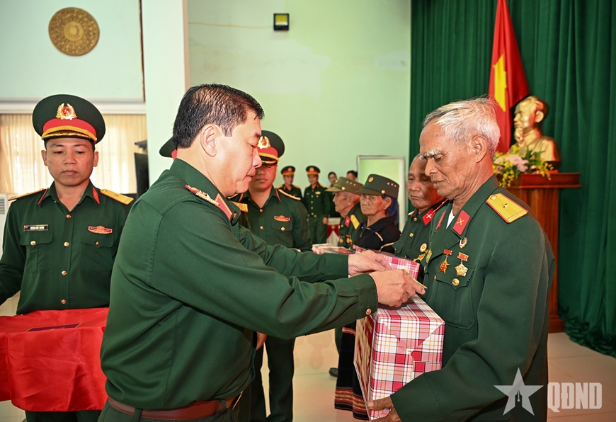 | Thượng tướng Trương Thiên Tô, Phó chủ nhiệm Tổng cục Chính trị Quân đội nhân dân Việt Nam trao quà tặng các gia đình chính sách. |