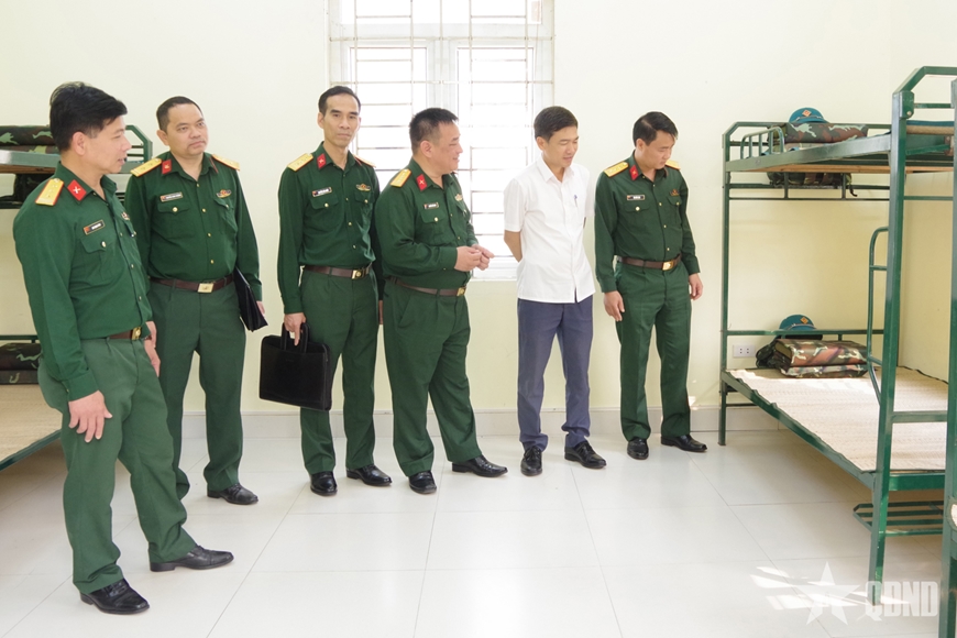 | Đại tá Nguyễn Đức Lâm cùng các đại biểu kiểm tra nơi sinh hoạt của các đồng chí dân quân tự vệ tham gia huấn luyện. |