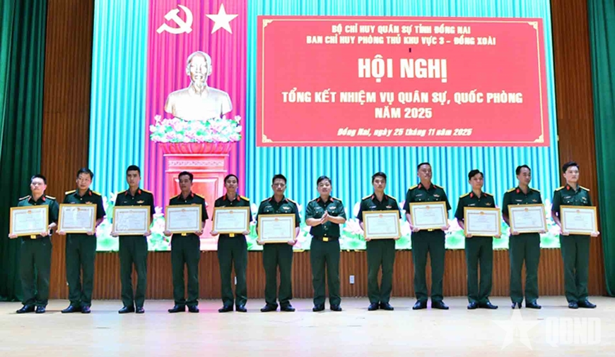 Ngày 25-11, Ban chỉ huy Phòng thủ khu vực 3 - Đồng Xoài (Bộ CHQS tỉnh Đồng Nai) tổ chức Hội nghị tổng kết nhiệm vụ quân sự, quốc phòng năm 2025, triển khai nhiệm vụ năm 2026.