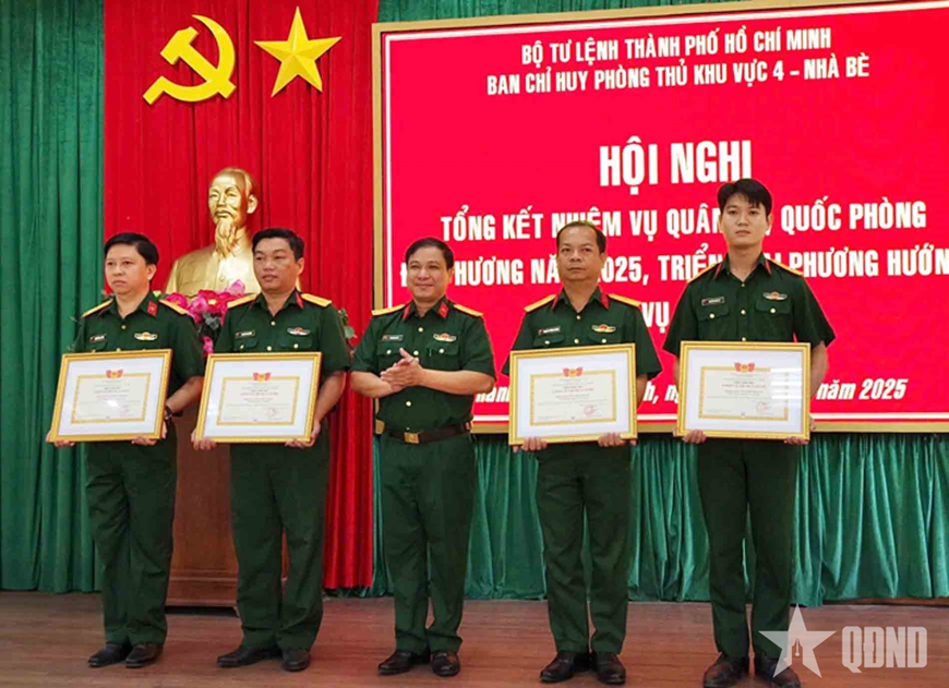 Dịp này, Ban chỉ huy Phòng thủ khu vực 4 - Nhà Bè đã khen thưởng 19 cá nhân có thành tích xuất sắc trong Phong trào Thi đua Quyết thắng năm 2025.