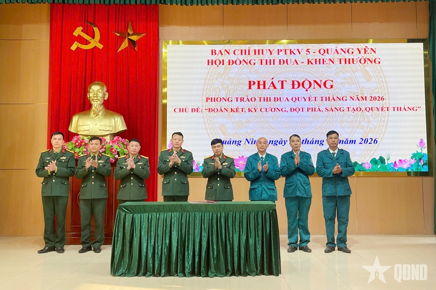 Sáng 12-1, Ban Chỉ huy Phòng thủ khu vực (PTKV) 5 - Quảng Yên, Bộ CHQS tỉnh Quảng Ninh tổ chức phát động Phong trào Thi đua Quyết thắng năm 2026 với chủ đề: “Đoàn kết, kỷ cương, đột phá, sáng tạo, quyết thắng”.