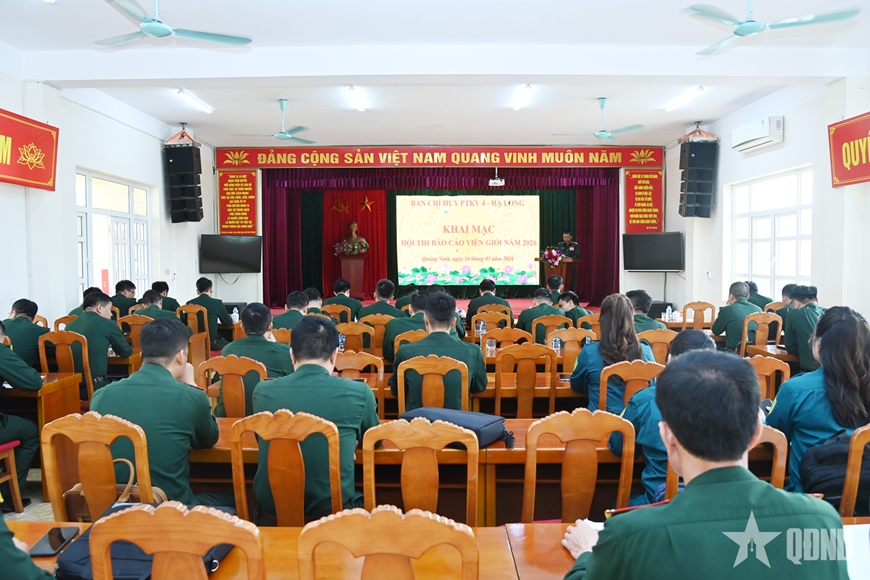 Sáng 24-3, Ban Chỉ huy phòng thủ khu vực (PTKV) 4 - Hạ Long (Bộ CHQS tỉnh Quảng Ninh) tổ chức khai mạc Hội thi Báo cáo viên giỏi năm 2026. Thượng tá Nguyễn Văn Việt, Phó chính ủy Bộ CHQS tỉnh đến dự và chỉ đạo.