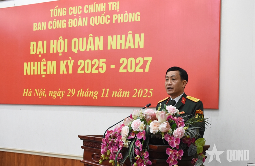 Đại tá Nguyễn Văn Đề, Trưởng ban Công đoàn Quốc phòng trình bày báo cáo kết quả hoạt động của Hội đồng Quân nhân nhiệm kỳ 2023-2025.