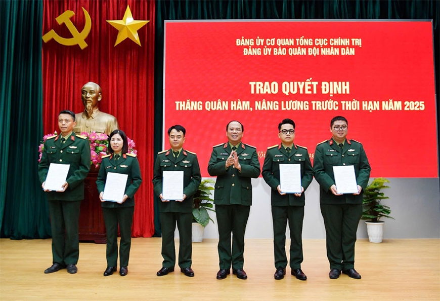 | Thiếu tướng Đoàn Xuân Bộ trao Quyết định thăng quân hàm, nâng lương trước thời hạn năm 2025 cho cán bộ, phóng viên. |