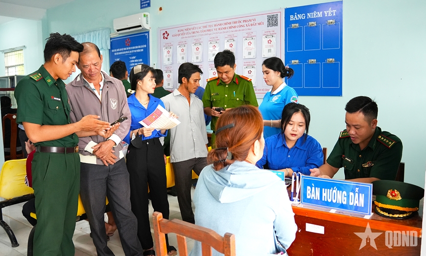 Cán bộ, chiến sĩ Đồn Biên phòng Đất Mũi và đoàn viên địa phương hỗ trợ chuyển đổi số - vận hành mô hình chính quyền địa phương 2 cấp.