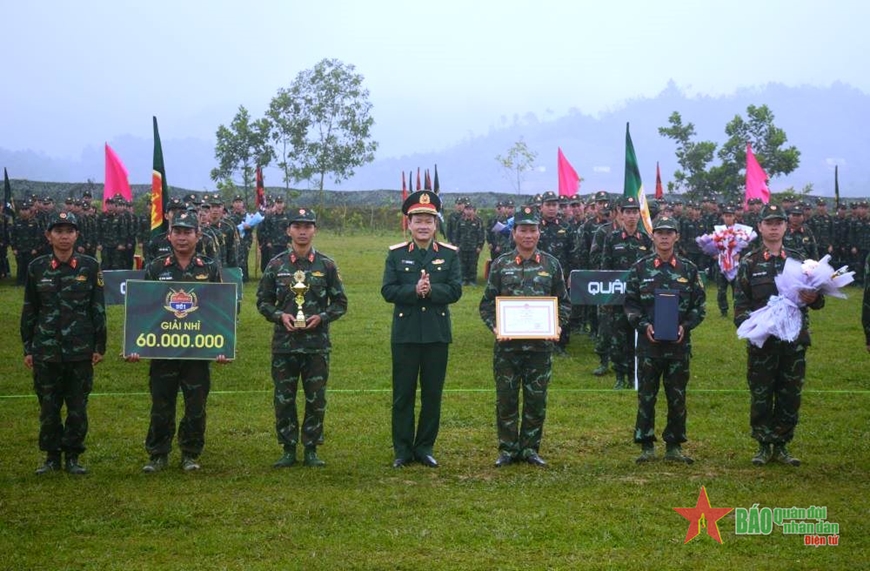 | Trung tướng Nguyễn Văn Đức, Cục trưởng Cục Tuyên huấn, Tổng cục Chính trị Quân đội nhân dân Việt Nam trao thưởng cho đội giành giải nhì. |
